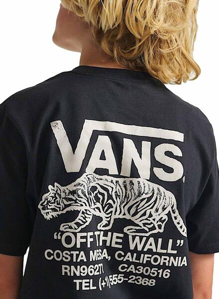 Shirt Vans. Modell Sneaky. Farbe schwarz. Rundhalsausschnitt. Kurze Ärmel. Reguläre Passform. Illustration eines Tigers auf der Brust und auf dem Rücken aufgedruckt. Details in Weiß.