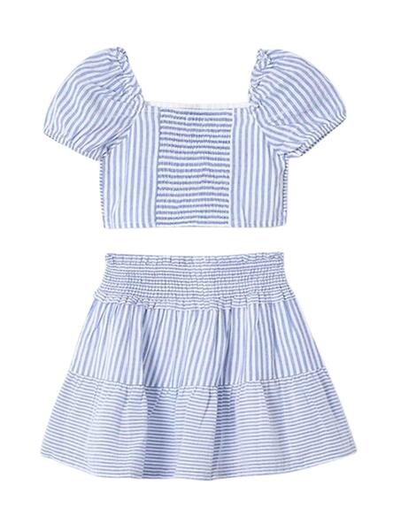 Set Mayoral mit blau gestreiftem Rock für Mädchen.