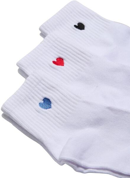 Socken Pieces. Modell Mova. Pack mit 3 Paar Socken. Details mit Herzstickerei in Blau, Rot und Schwarz. Gerippte Knöchel. Hauptfarbe Weiß.