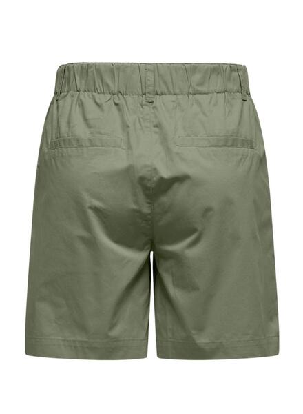 Bermuda Only . Modell Zora. Grüne Farbe. Reißverschluss und Knopfverschluss. Gürtelschlaufen. Lockere Passform. Hohe Taille. Seitentaschen und Gesäßtaschen.