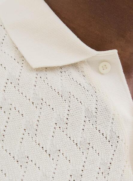 Polo Jack and Jones Latrent. Farbe beige. Hemdkragen mit zwei Knöpfen. Kurze Ärmel. Markenetikett an der Seite. Reguläre Passform. Gestanzter Stoff.