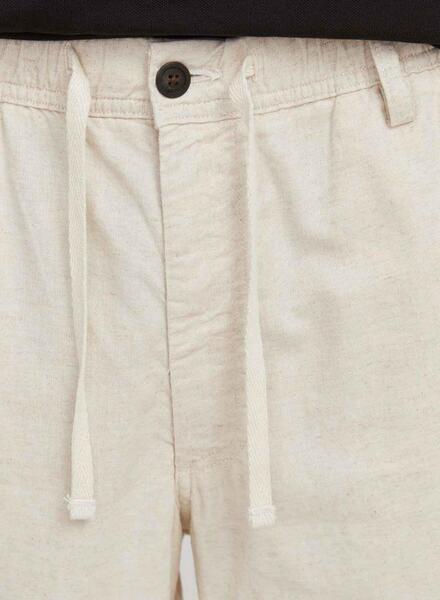 Bermudas von Jack and Jones. Modell Jaiden. Farbe beige. Elastischer Bund mit Kordelzug. Vier Taschen. Markenlogo gestickt. Länge bis zum mittleren Oberschenkel. Lockerer Schnitt. Stoff aus Leinenmischung. Vorderer Verschluss mit Reißverschluss und Knopf. Gürtelschlaufen an der Taille.