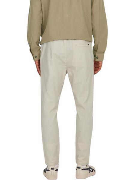 Hose Only and Sons. Modell Linus. Farbe beige. Jogger-Stil. Seitentaschen und Gesäßtaschen. Mittlere Leibhöhe. Elastischer Bund mit Kordelzug. Länge bis zu den Knöcheln. Tapered Fit.