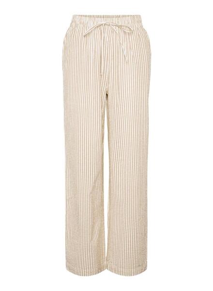 Hose Pieces. Modell Sally. Beige und Toastfarbe. Gewebe mit vertikalen Streifenmuster. Seitentaschen. Elastischer Bund mit verstellbarem Kordelzug. Pyjama-Stil.