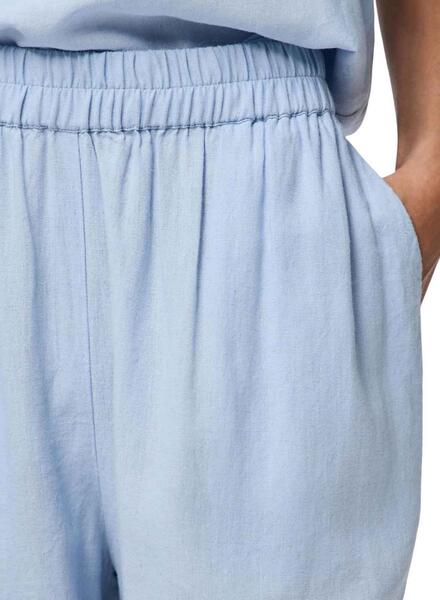 Kurze Stücke. Modell Pia. Hellblaue Farbe. Jogger-Stil. Elastischer Bund. Minilänge. Seitentaschen. Leichtes Gewebe mit Leinen.