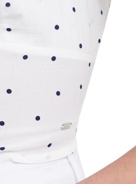 Top Superdry. Quincy-Modell. Weiße Farbe. Tupfenmuster. Kurzformat. Kurzärmelig. Knopfverschluss vorne. Rückseite mit Wabe. Rüschendetail. Das Modell trägt Größe S.