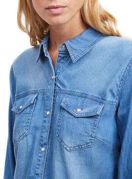 Hemd Vila. Model Vibista Denim. Blaue Farbe. Langarm mit Knopf am Ende. Schließen Sie mit Druckknöpfen. 2 Taschen mit Patte auf der Brust.