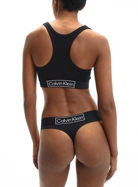 BH Calvin Klein. Unlined Modell. schwarze Farbe. Elastische und gekreuzte Träger. Keine Schließung. Calvin Klein Logo auf der Vorderseite in Weiß.