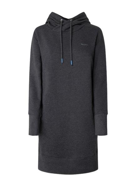 Kleid Pepe Jeans. Gisela Modell. Sweatshirt-Stil. Mit fester Kapuze. Gerippte Abschlüsse. Dunkelgraue Farbe. Kordelzüge an der Kapuze. Kontrastierendes kleines Logo auf der Brust.
