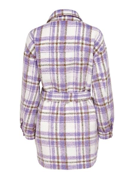 Jacke-Hemd Only. Hannah Modell. Mit kariertem Aufdruck. Lila und weiße Farbgebung. Zwei Pattentaschen auf der Brust. Gürtel- und Knopfverschluss.