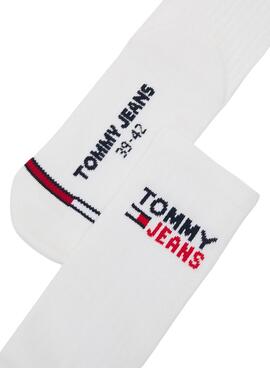 Socken Tommy Hilfiger für Mann und Frau. Farbe weiß. Stretch-Stoff. hoher Stock Logo oben am Stock und am Fuß. Kontrastband an der Spitze.