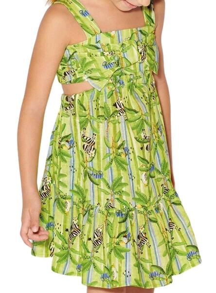 Kleid Mayoral. Modell ausschneiden. Printed integriert in grün. Quadratischer Ausschnitt. Öffnung im Rücken. Detail mit Rüschens und Schlaufes. Elastische Taille.