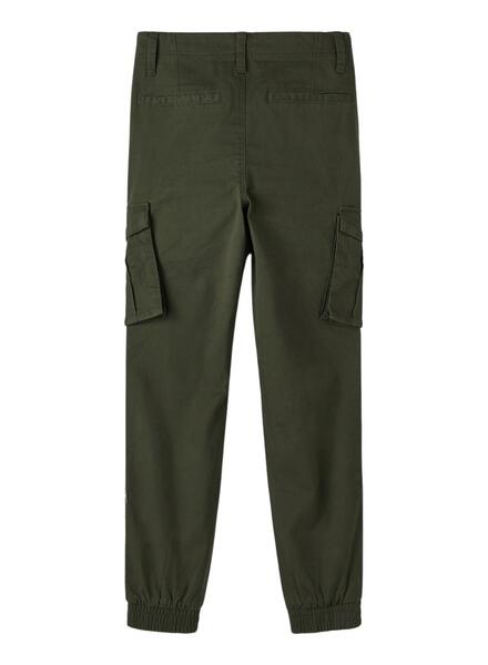 Hose Cargo Name It. Ryan-Modell. Farbe dunkelgrün. Baumwoll-Twill-Stoff. Reißverschluss und Hook-Taste. Mehrere Taschen. Gefälschte hintere Tasches.