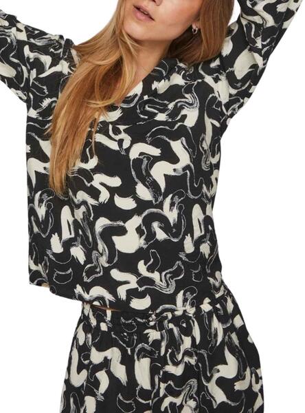 Hemd Vila. Vidogma Modell. Printed integriert. Farbe schwarz und weiß. V-Ausschnitt. Ärmels gepufft. Schulterlineal. Elastische Bündchen. Das Model trägt Größe 38.