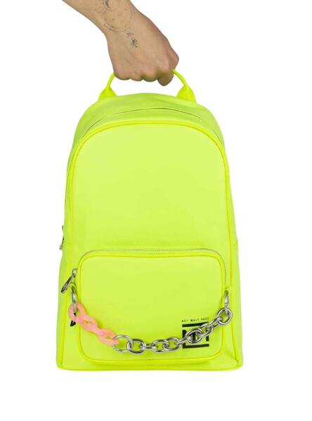 Rucksack Munich. Farbe Limettengrün. Neon. Verstellbare Schultergurte. Oberer Befestigungsstreifen. Dekorative Kette. Zwei Taschen, eine vorne und die Haupttasche, mit Reißverschluss. Logo gestempelter Markentyp. Silberne Details.