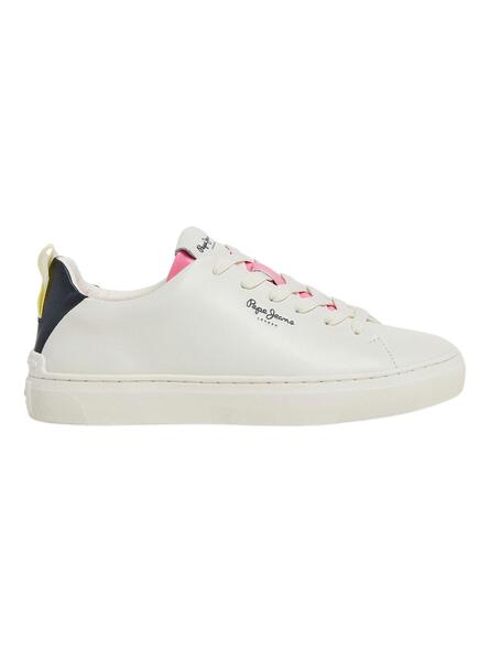 Sneakers Pepe Jeans. Camden-Modell, Farbe weiß. Schnürverschluss. Leder recycelt. Logo-Seite. Gummi-Cupsohle. Marineblaue Kontrasteinsätze. Rosa Zunge.