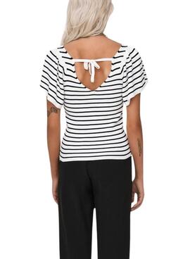 T-shirt Only. Modell Leelo. Farbe Weiß. Kurze Ärmel. Weiter Ausschnitt. Offener Rücken mit Kordel. Gestreiftes Design.