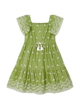 Kleid Mayoral. Kontraststickereien. Grüne Farbe. Ärmellos mit Volant. Elastischer Bund. Mit Volants. Schleifendetail auf der Taille.
