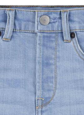 Kurze Hosen Levis. Modell 501. Farbe blau. 5 Taschen. Knopfleiste und Knopfverschluss. Zerstörungsdetail am unteren Rand.