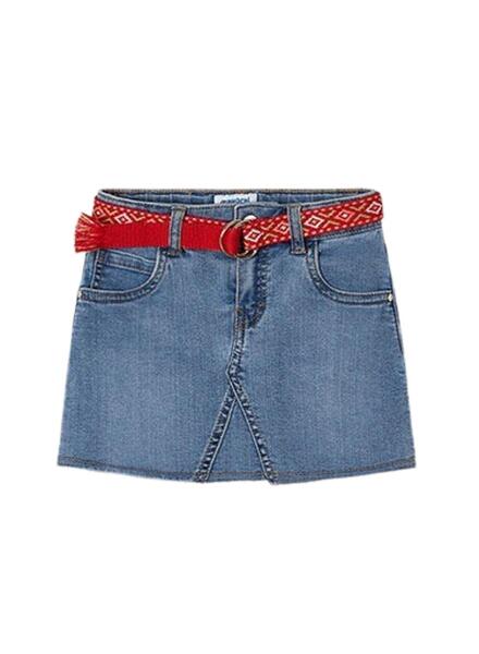 Jeansrock von Mayoral. Mittelwäsche. Mit bedrucktem Gürtel in Rot. Mittelschwerer Denim-Stoff. 5 Taschen. Dekorative Nähte.