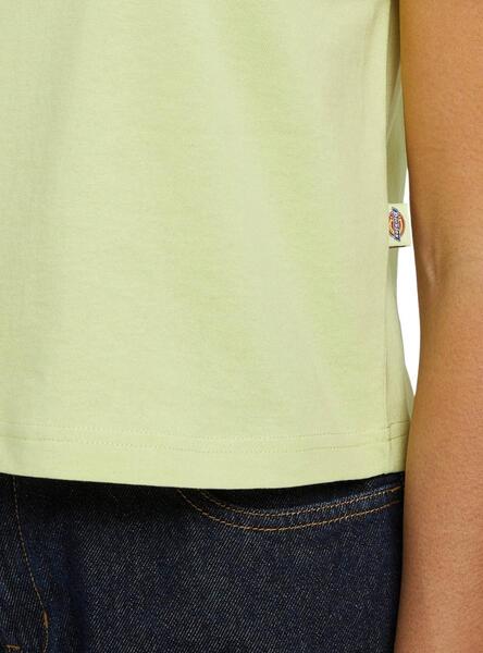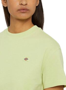 Dickies T-Shirt. Modell Oakport. Farbe grün. Rundhalsausschnitt. Kurze Ärmel. Quadratische Passform. Geschnittenes Oberteil. Gesticktes Logo auf der Brust.