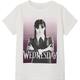 T-Shirt Name It. Modell Jax. Farbe schwarz. Rundhals. Kurze Ärmel. Lockere Passform. Bilder von Wednesday auf der Vorderseite gedruckt. Details in Blau.