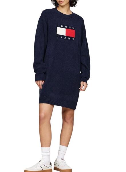 Kleid Tommy Jeans. Marineblau. Gestrickt mit Wolle. Weite Passform. Lange Ärmel. Rundhalsausschnitt. Tommy-Logo auf der Brust. Überschnittene Schultern. Das Model trägt Größe S.