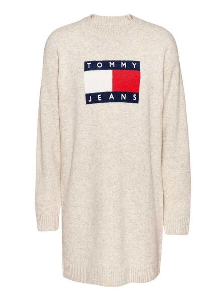 Kleid Tommy Jeans. Beige Farbe. Weicher Strickstoff. Mit Wolle. Weit geschnitten. Lange Ärmel. Runder Ausschnitt. Tommy-Logo auf der Brust. Überschnittene Schultern. Das Model trägt Größe S.