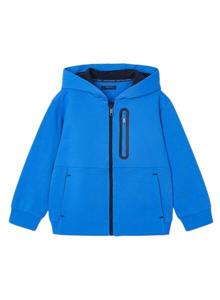 Jacke von Mayoral. Leuchtend blaue Farbe für Jungen. Kapuze und Reißverschluss. Mischung aus weicher Baumwolle. Drei Taschen, eine mit Reißverschluss. Marineblauer Besatz. Kapuze mit Kontrastfutter. Gummi-Patch auf der Rückseite.