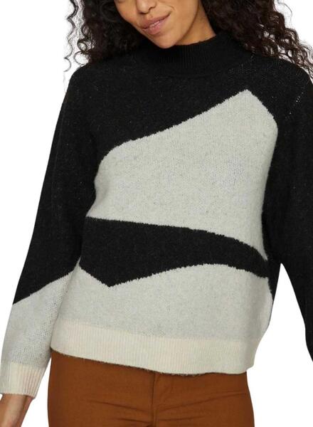 Pullover Vila. Modell Vicilia. Farbe Schwarz und Weiß. Gerippte Abschlüsse. Stehkragen. Reguläre Passform. Weiches Gewebe. Geometrisches Jacquardmuster.