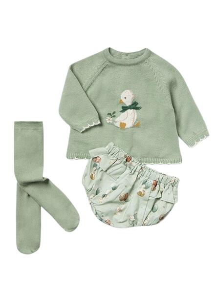 Set Mayoral. Pullover + Strampler. Seerosegrüne Farbe. Rundhalsausschnitt. Langarm-Pullover. Entenmuster mit Schleife. Inklusive Windelüberzug.