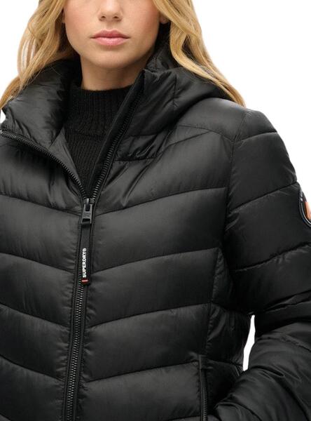 Superdry Jacke. Modell Fuji. Farbe Schwarz. Reißverschluss. Seitentaschen. Kapuze. Markenpatch am Ärmel. Leicht taillierter Schnitt in der Taille. Markenzeichen auf dem Rücken.