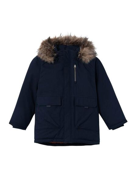 NAME IT Jacke. Winddicht. Abnehmbare Kapuze. Lange Ärmel. Gerippte Bündchen. Reißverschluss. Hohe Isolierung. Wasserabweisend, OHNE PFAS. Vordertaschen mit Druckknopf. Brusttaschen mit Reißverschluss. Kunstpelz.