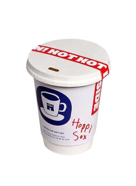 Socken Happy Socks. Modell Coffee. Geschenkpackung mit einem Paar Socken. Farbe Kamel. Hochwertige gekämmte Baumwolle. Reguläre Passform. Geschlechtsneutral. Bedruckt mit Kaffeetassen. Details in Rot und Blau.