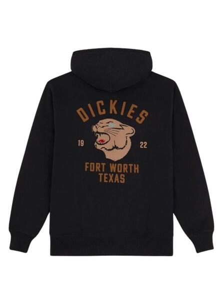 Dickies Kapuzenpullover. Modell Panther. Farbe schwarz. Verstellbare Kapuze mit Kordelzug. Markenlogo auf der Brust. Grafikdruck auf dem Rücken. Bequeme Tasche.