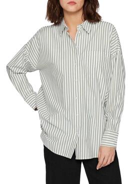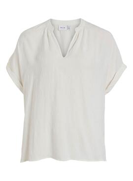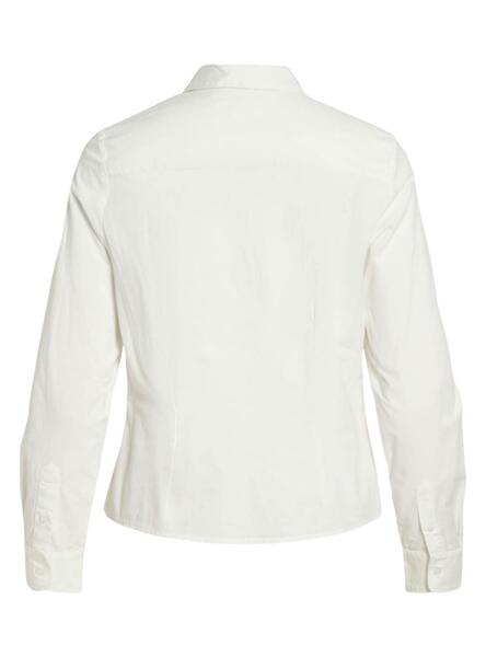 Bluse Vila. Farbe: Weiß. Lange Ärmel. Normaler Kragen. Taillierter Schnitt. Vorderverschluss mit Knöpfen. Das Model trägt Größe 36.
