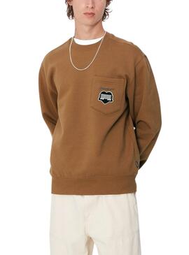 Carhartt Kapuzenpullover. Farbe geröstet. Kapuze mit Kordelzug. Rippenbündchen. Kängurutasche. Lockerer Sitz. Amerikanisches Logo gestickt auf der Brust. Das Model trägt Größe M.