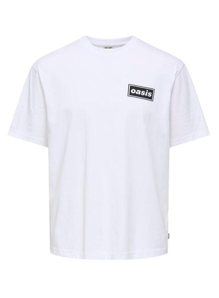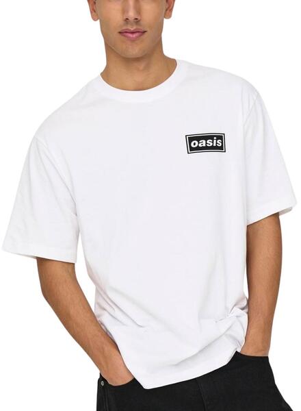 T-Shirt von Only and Sons. Farbe weiß. Modell Oasis Definitely Maybe. Kurze Ärmel. Rundhalsausschnitt. Hergestellt aus Baumwolle. Oasis-Banddruck auf Brust und Rücken. Lockerer Schnitt. Limitierte Auflage.