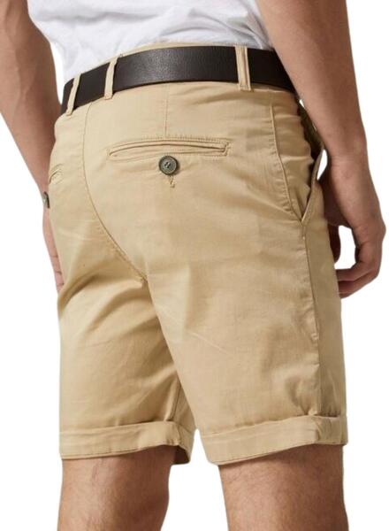 Bermuda Altonadock. Farbe beige. Gürtelschlaufen. Seitentaschen. Umschlag am Saum. Das Modell trägt Größe M.