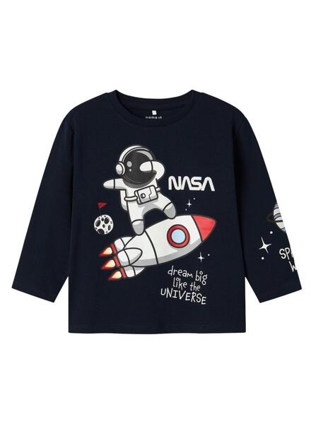 T-Shirt Name It. Marineblau. Rundhalsausschnitt. Lange Ärmel. NASA-Druck auf der Vorderseite. Ein ärmeldruck. Reguläre Passform.