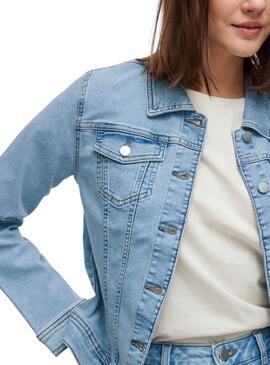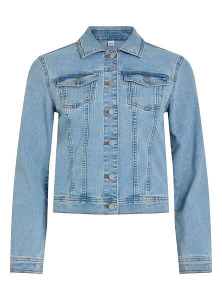 Jeansjacke von Vila. Modell Vinus. Helle Jeans. Metallknopfverschluss. Seitentaschen. Brusttaschen mit Aufnähern. Reguläre Passform. Elastischer Stoff.