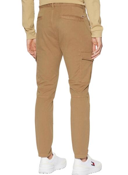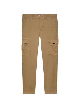 Hose Tommy Jeans. Modell Austin. Farbe Kamel. 4 Taschen und 2 Cargo-Taschen an den Beinen. Verschluss mit Knopf und Reißverschluss. Gürtelschlaufen.