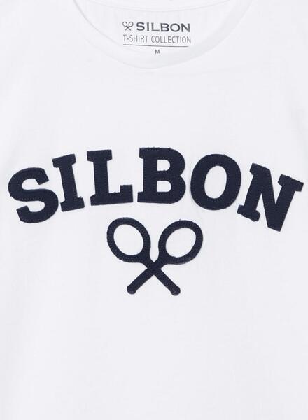 T-Shirt Silbon. Modell Schläger. Farbe weiß. Logo mit gesticktem Markenlogo auf der Brust. Details in Blau. Kurze Ärmel. Runder Halsausschnitt. Reguläre Passform.