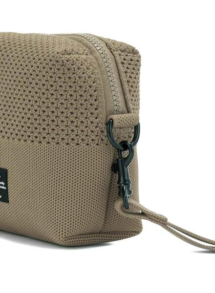 Handtasche Ecoalf. Modell Ocean Tikaaf. Farbe Tannengrün. Reißverschluss. Markenetikett außen. Kleiner abnehmbarer Handgelenkriemen. Gestrickter Stoff mit verschiedenen Mustern. Maße: 17 x 14 x 6 cm.
