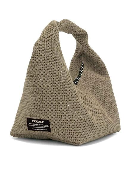 Tasche Ecoalf. Modell Tikaalf Mini. Farbe Taupe. Offene Strickstruktur. Gedrehter Handgriff. Druckknopfverschluss. Markenetikett an der Seite. Maße: 30 x 23 x 15 cm.