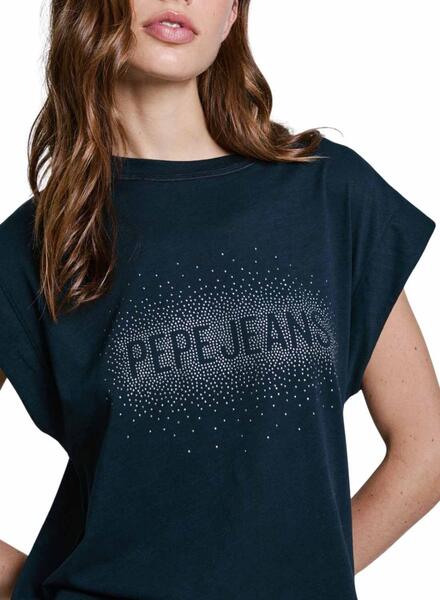 T-Shirt Pepe Jeans. Streifenmodell. Marineblau. Runder Ausschnitt. Kurze Fledermausärmel. Logo aus silbernen Nieten auf der Vorderseite. Regulärer Schnitt.