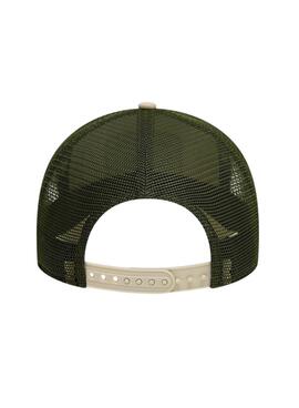 Trucker-Kappe New Era. Modell Büffel. Farbe beige. Patch Trucker. Atmungsaktives grünes Netzgewebe hinten. Gebogener Schirm. Verstellbarer Verschluss. New Era Logo. Distinktiver Aufkleber.