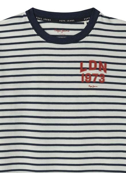 T-Shirt von Pepe Jeans. Modell James. Weiß und dunkelblau. Gestreiftes Muster. Logo auf der Brust. Runder Ausschnitt. Kurze Ärmel. Reguläre Passform. Für Jungen.