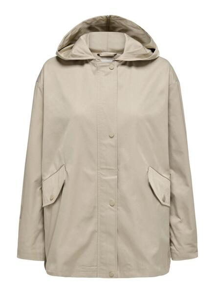 Only Jacke. Mit Kapuze. Lange Ärmel. Beige Farbe. Knopfverschluss. Seitentaschen mit Klappe und Knopf. Reißverschlussdetail an der Kapuze. Regularer Schnitt.