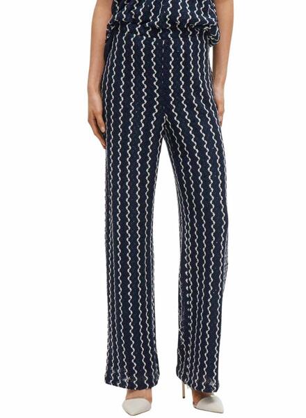 Hose von Vila. Elastischer Bund. Strukturiertes Gewebe. Marineblau. Aufdruck in Weiß. Gerader Schnitt. Das Model trägt Größe S.